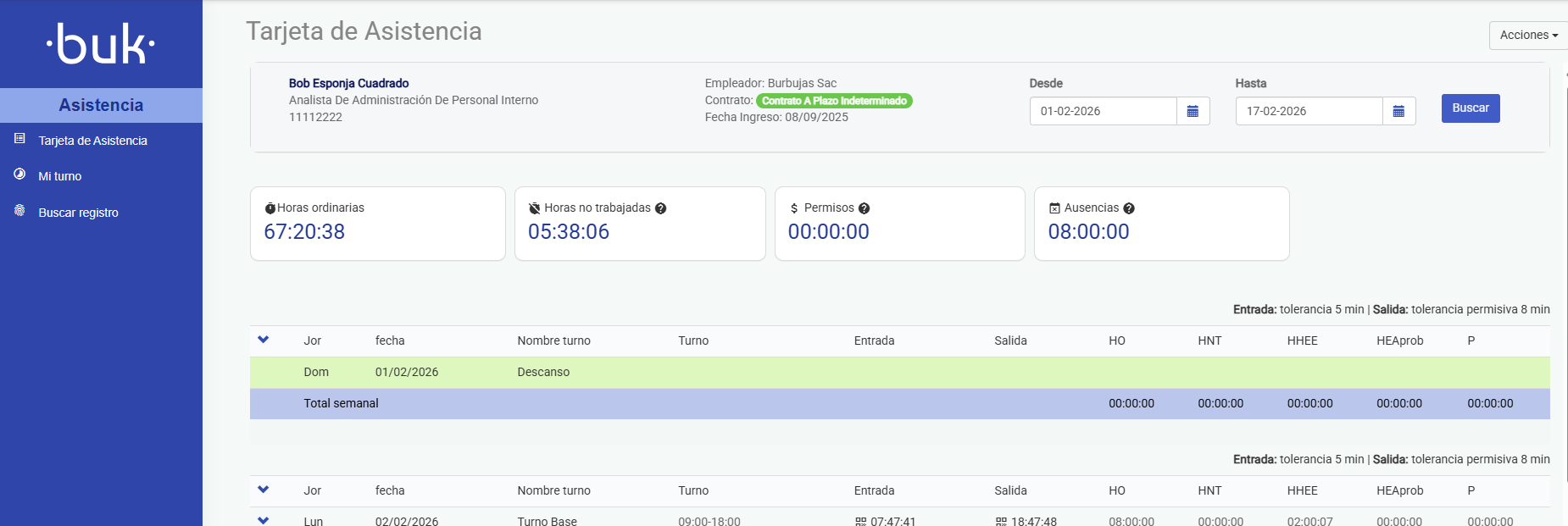 El colaborador tendrá una vista de su tarjeta de asistencias junto con sus datos personales, contrato, cargo, turno asignado y horas de la jornada laboral.
