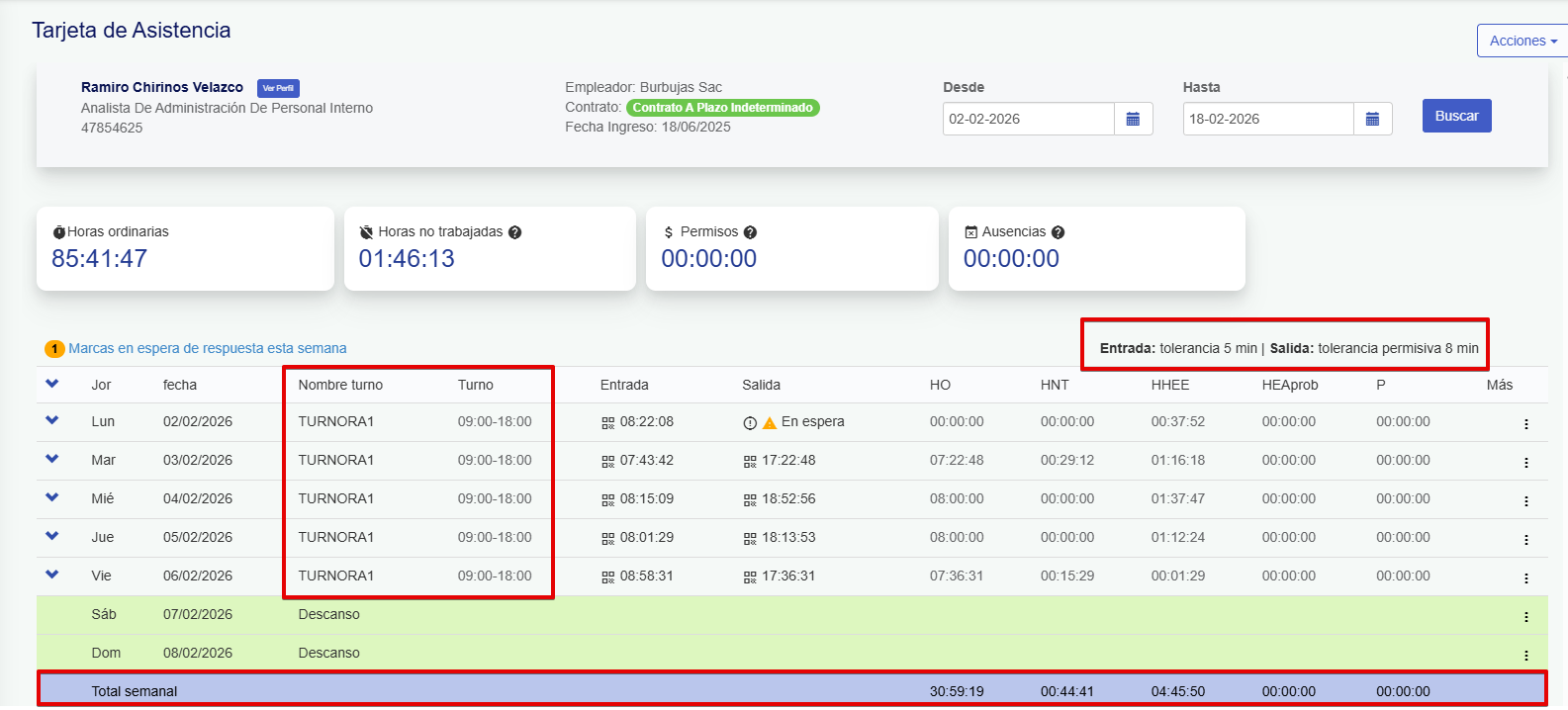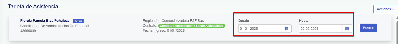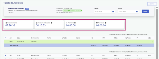 Primero visualizarás los datos del colaborador. Por defecto, se mostrará la tarjeta de asistencia correspondiente al período en curso; no obstante, podrás filtrar la información por un rango de fechas de hasta 35 días como máximo.