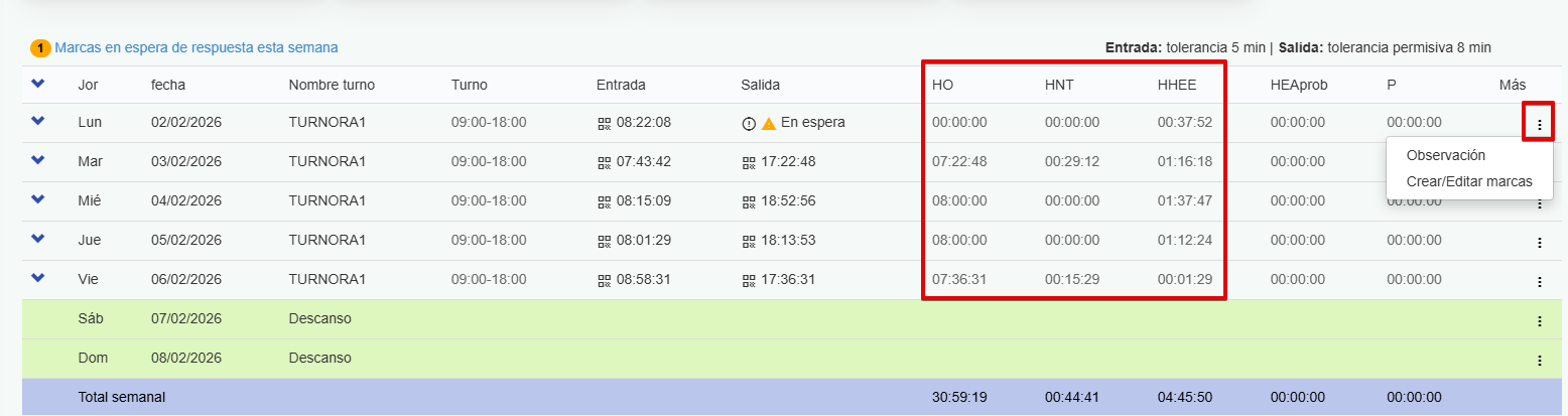 Los cálculos de horas ordinarias, horas no trabajadas y horas extras dependen del turno asignado para cada día.
