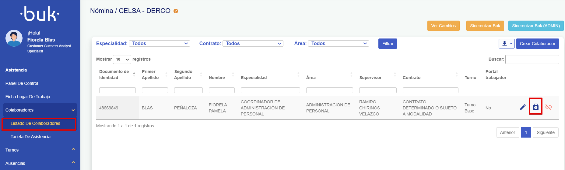 Para acceder a la tarjeta de asistencia de un colaborador existen distintas rutas. Una de ellas es desde la sección “Listado de colaboradores”, donde deberás buscar al colaborador y seleccionar el icono de reloj “Ver tarjeta de asistencia”.