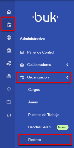 Debes dirigirte al módulo de Administrativo >> Organización >> Recintos
