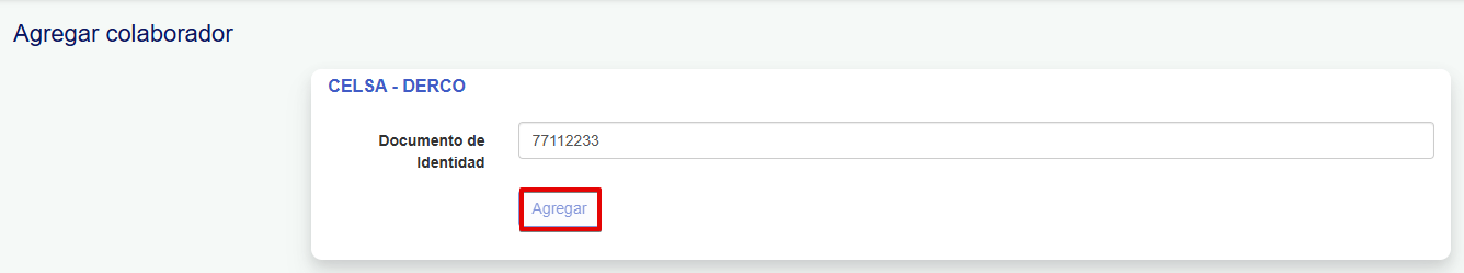 En la pantalla Agregar colaborador, ingresa el documento de identidad y presiona Agregar; con ello se desplegará la ficha en blanco para completar la información.