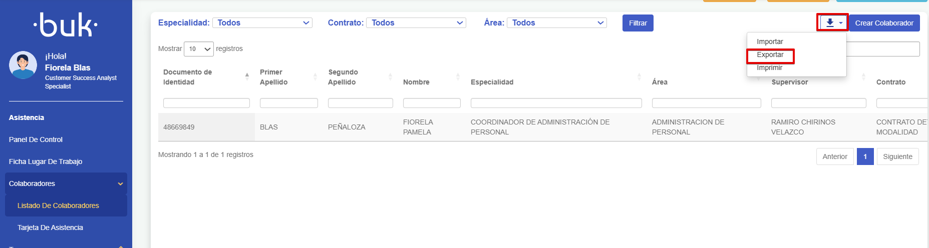Dirígete a Colaboradores >> Listado de colaboradores y, en el botón de descargas, selecciona “Exportar” para obtener la plantilla. Luego complétala con los datos solicitados.