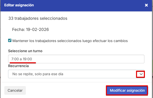Además, tienes la opción de modificar los turnos pasados, estableciendo una recurrencia si fuera necesario.