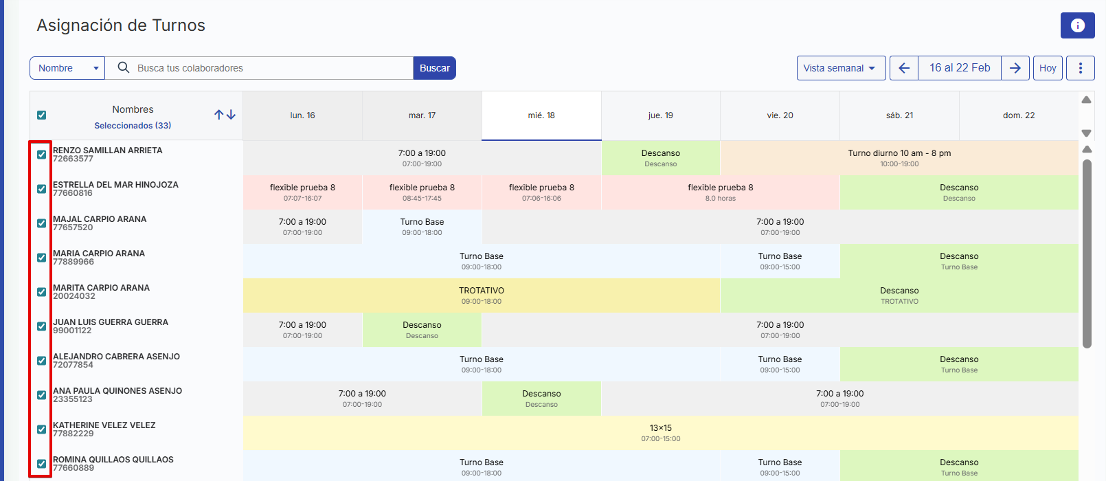 Desde esta vista podrás seleccionar a los colaboradores a quienes deseas asignar un turno, utilizando los distintos filtros disponibles. Al elegir a más de un colaborador y seleccionar una fecha, el cursor cambiará para permitir la asignación masiva de turnos.