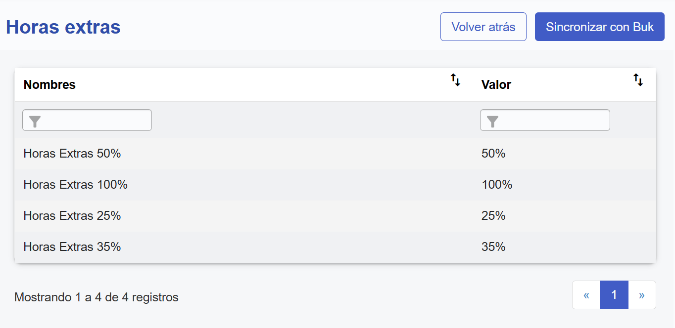 En esta pantalla podrás sincronizar desde el módulo de remuneraciones los tipos de horas extras que ya tengan creados. Solo deberás presionar el botón "Sincronizar con Buk" para obtener la información que necesitas.