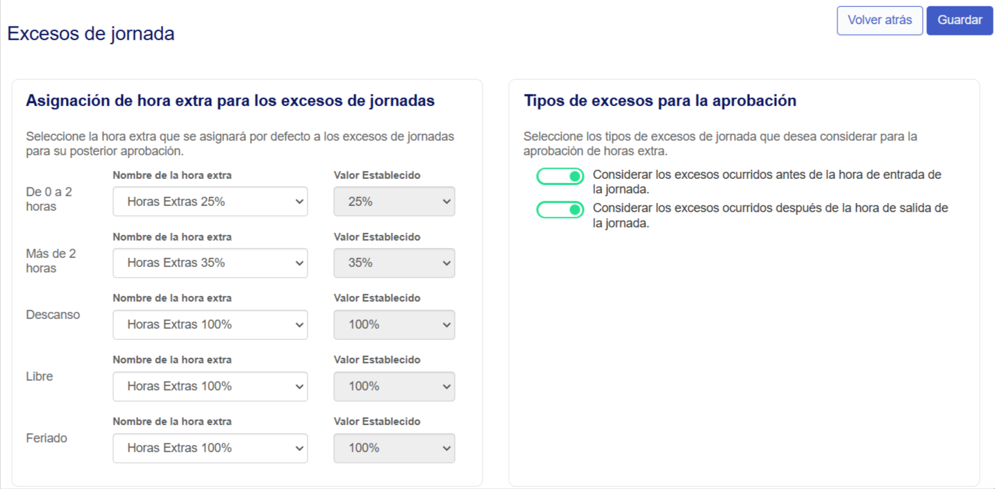 Debes configurar las reglas asociadas a los excesos de jornada, sincronizando los tipos de horas extra que ya existen en el módulo de Plataforma.