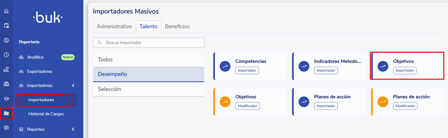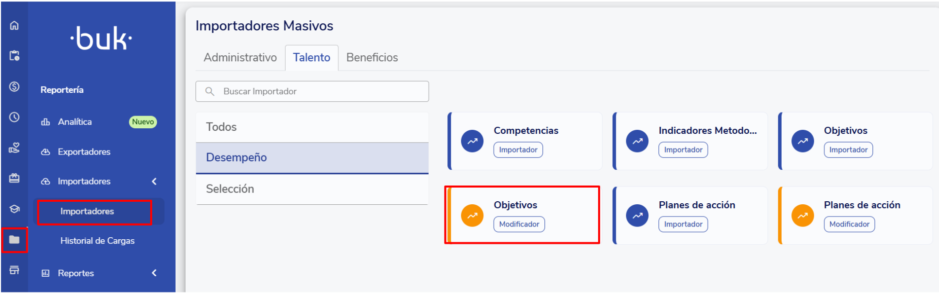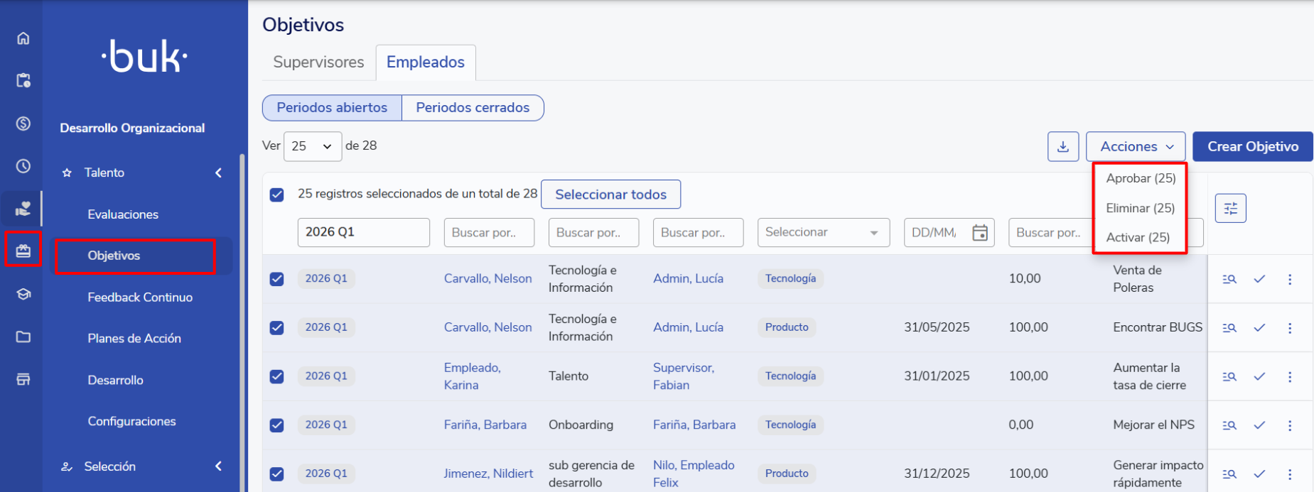 Puedes aprobar y activar varios objetivos de colaboradores al mismo tiempo desde la sección de Objetivos o utilizando las herramientas de importación y modificación masiva en Buk. El importador se usa para cargar nuevos objetivos y el modificador para actualizar objetivos ya existentes.
