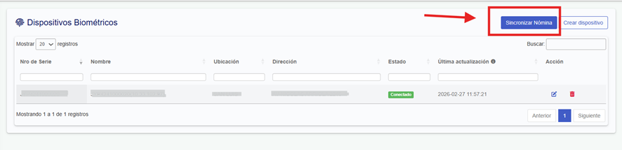 Tuerca (Administración) > Dispositivos de marcaje > Dispositivos biométricos > clic en “Sincronizar nómina”.