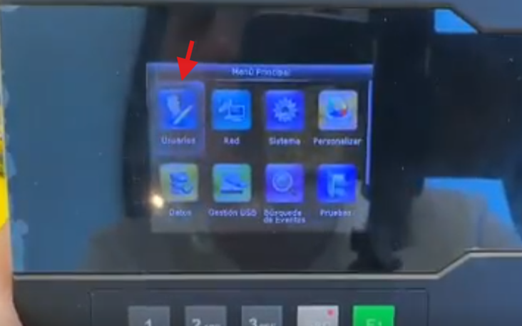Ingresamos al menú principal del dispositivo biométrico con la tecla M/OK y nos identificamos como usuario administrador. Luego, selecciona Usuarios
