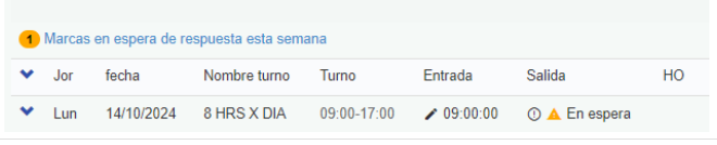 Guardados los cambios, la tarjeta de asistencia mostrará un mensaje en la parte superior, indicando que existen marcas en espera de respuesta.