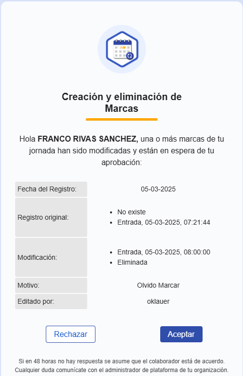 Además un mensaje que especifica el plazo de 48 horas que tiene el colaborador para responder a esta modificación antes de que se apruebe automáticamente.