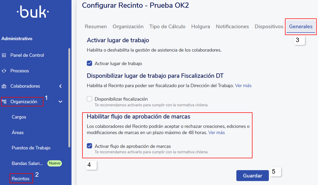 Para activar esta función, desde el módulo Buk Web App nos dirigimos al menú lateral la ruta: