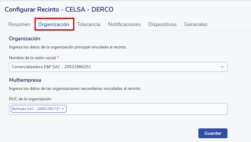 Organización - En esta pestaña debes seleccionar una empresa principal y otra secundaria para vincularlas al lugar de trabajo. Si fuera necesario pueden agregar otras empresas relacionadas al mismo lugar de trabajo.