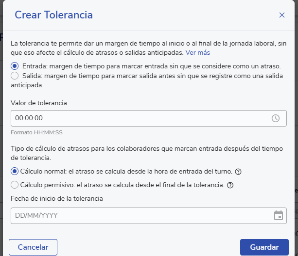 - En las pestaña de tolerancia no contamos con el botón de guardar, por lo que se debe crear la tolerancia de entrada y salida. Si no tienes un tiempo de tolerancia definido en tu organización, puedes crear una tolerancia con tiempo 0.