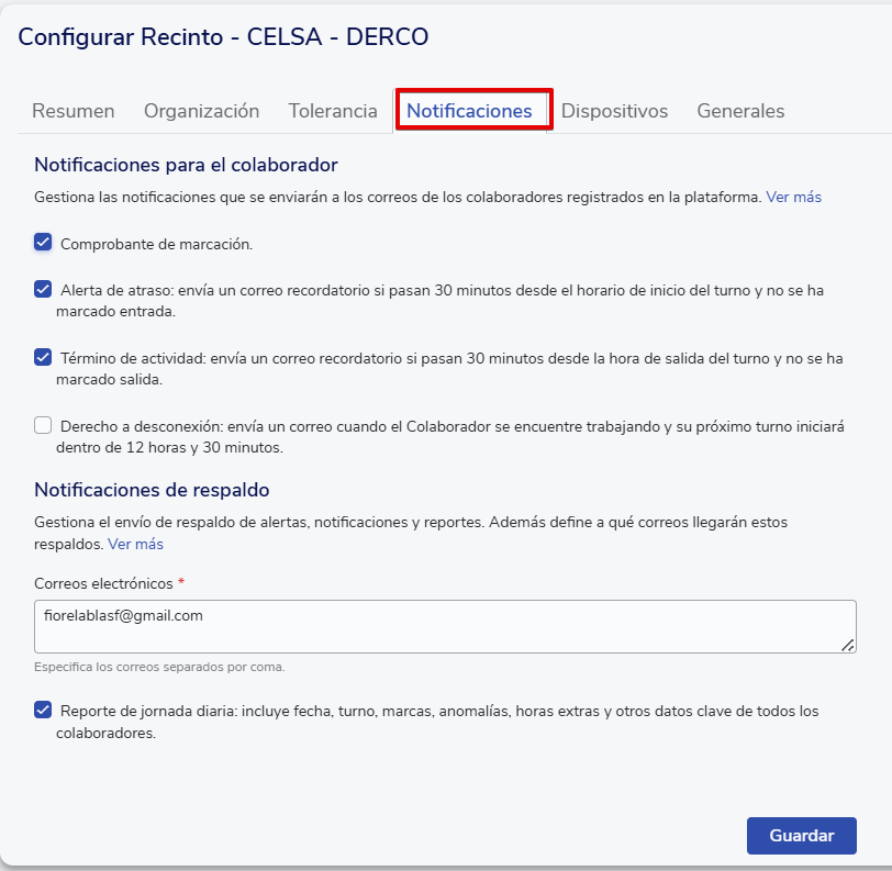 Notificaciones - Acá encontramos las configuraciones relacionadas principalmente, al envío de comprobante de asistencia, alertas de la plataforma como la de atraso, término de actividad y derecho a desconexión.