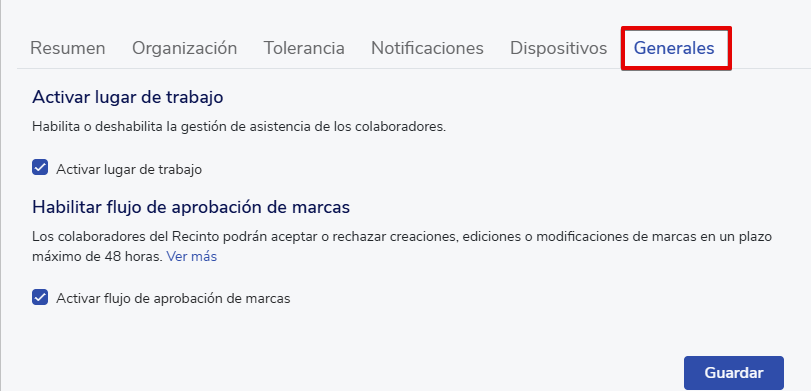 Generales - La pestaña “Generales” mostrará configuraciones del recinto en donde hoy se encuentran: