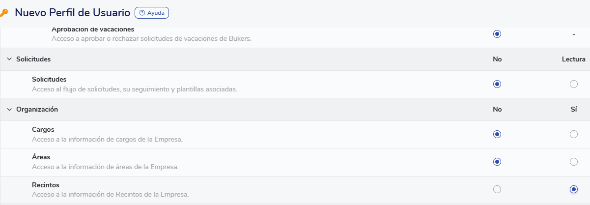 - Para que un usuaro, diferente al Administrador, pueda ejecutar el proceso de creación/modificación de recintos, deberá contar con la opción "Recintos" habilitada en su perfil.