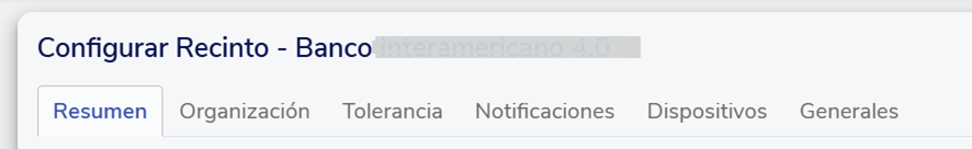 Al seleccionar la ⚙️ configuración de un recinto podrá ver las configuraciones del lugar de trabajo agrupadas por temas en las siguientes pestañas: