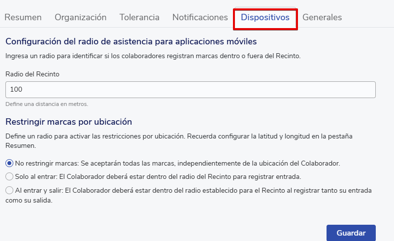 Dispositivos - La pestaña "Dispositivos" contiene las configuraciones relacionadas ala radio de asistencia y las restricciones sobre este.