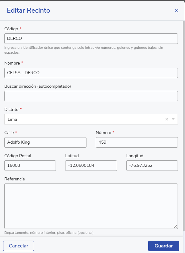 Para crear un nuevo recinto debes completar el formulario básico que solicita los datos de ubicación del recinto.