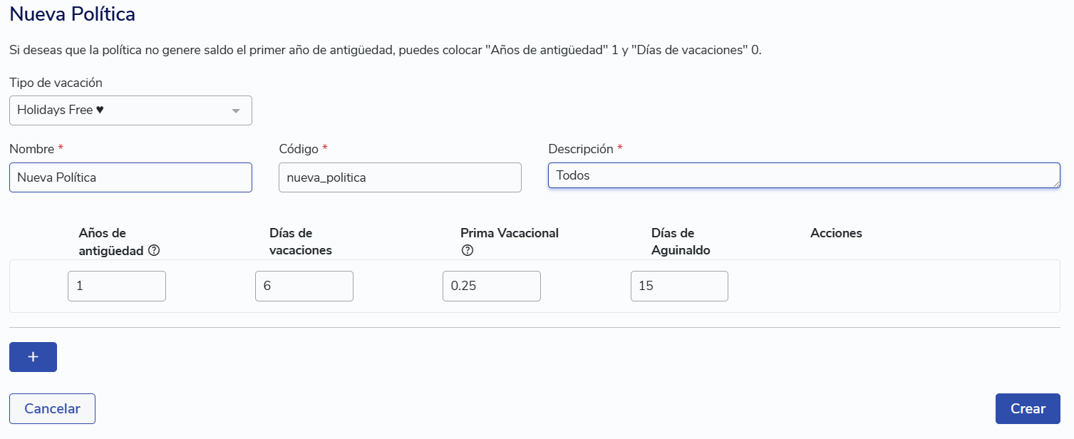 Esta pantalla te permite ver todas las políticas de vacaciones existente junto con las opciones de crear nuevas, editar o eliminar alguna política de vacaciones.