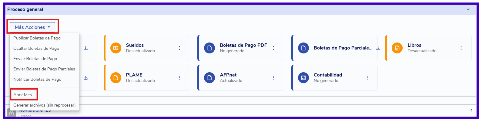 Abrir el mes de pago: Ve al año y el mes a abrir>Proceso general> Más acciones > Abrir Mes.