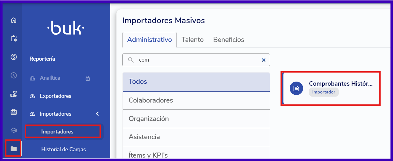 Accede al importador: Ingresa a Información > Importadores > Comprobantes Históricos.