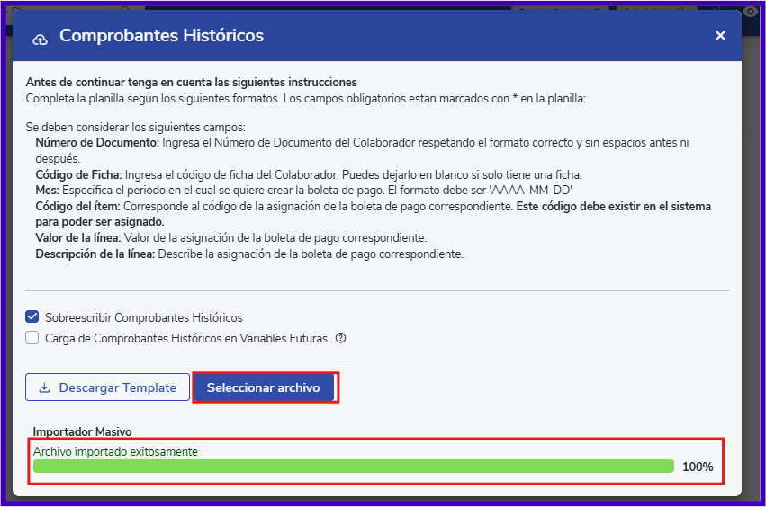 buk_utilidades_dias_trabajados y buk_utilidades_dias_licencias. Guarda el achivo y subelo a la plataforma, al terminar verás un mensaje confirmando el éxito de la carga de datos a las boletas históricas.