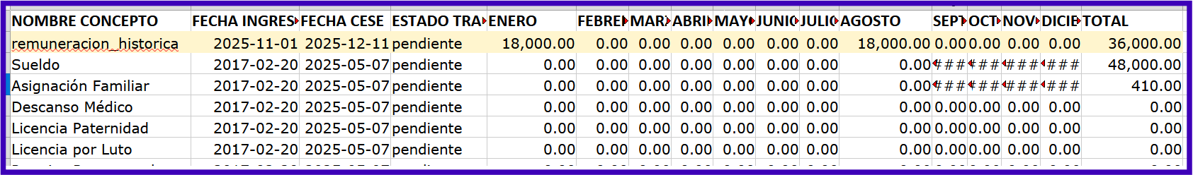 Detalle de Remuneraciones: Muestra los montos de cada item de remuneraciones de las boletas de pago y de las BBHH, las cuales aparecerán en una línea bajo el concepto "Remuneración Histórica".