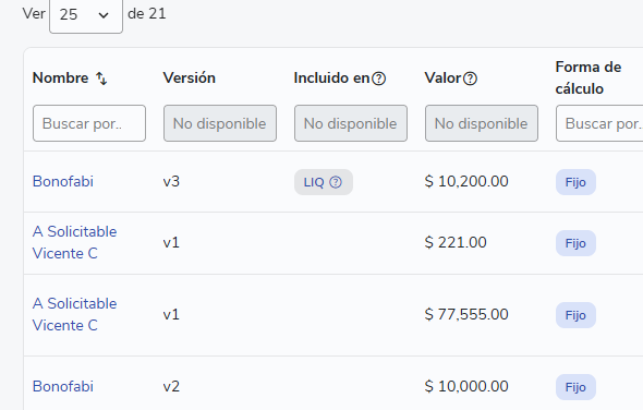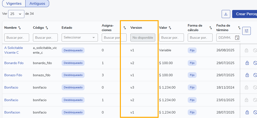 En la Configuración de Ítems: Desde el módulo de Administración, puedes ver la versión tanto en la lista de ítems vigentes como en los antiguos. Esto es útil para comparar cambios históricos del mismo concepto.