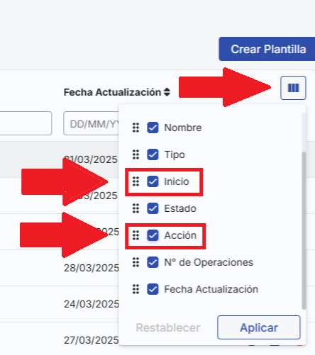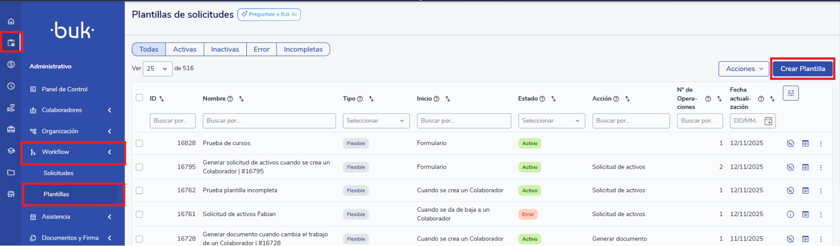 Puedes ver todas tus plantillas de solicitudes desde lavista de configuración de plantillas. Para identificar fácilmente cuáles están configuradas para iniciar automáticamente, puedes revisar las columnas"Inicio"y"Acción". Recuerda activarlas si las tienes ocultas.