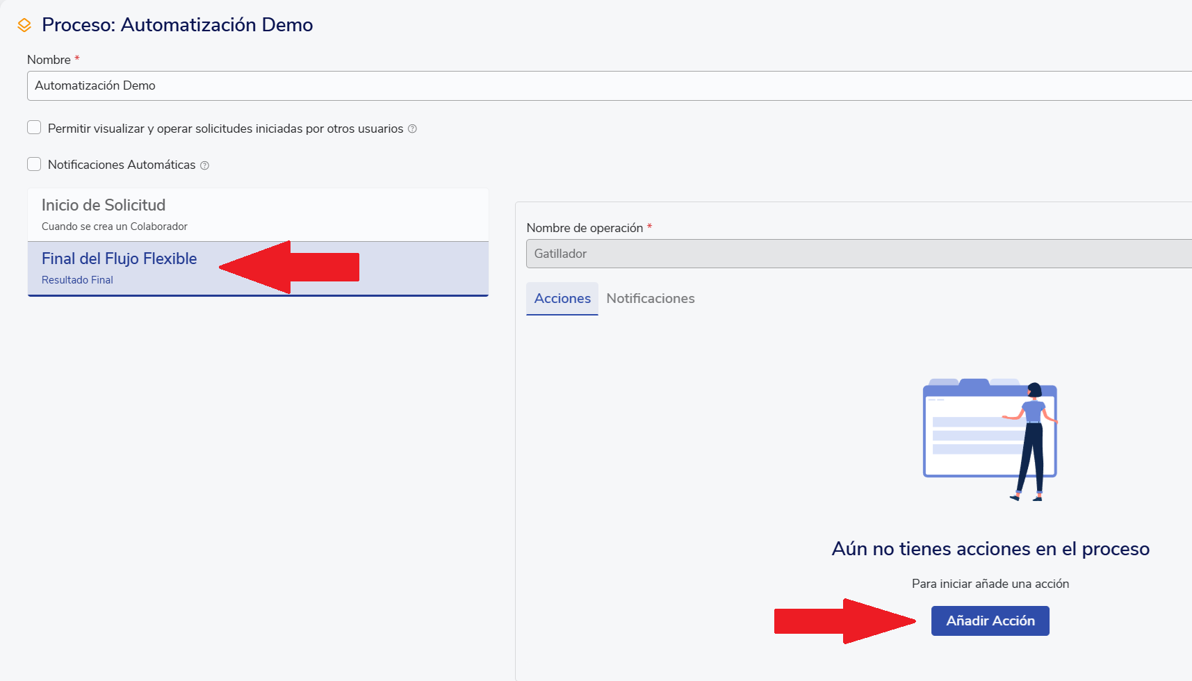 En la etapa final del flujo, podrás definirla acción que se ejecutará automáticamentecuando ocurra el evento:
