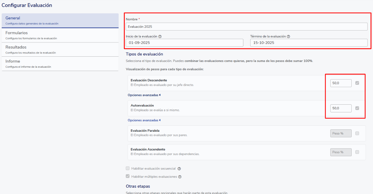 Algumas alterações serão refletidas imediatamente, enquanto outras exigem processamento adicional. As modificações em textos, datas e na quantidade máxima de avaliadores são aplicadas de forma imediata. Em contrapartida, os ajustes nos pesos por etapas, os pesos nas seções, as ponderações e a escala de resultados são processados durante a madrugada e estarão visíveis a partir do dia seguinte às 9:00, horário do Chile.