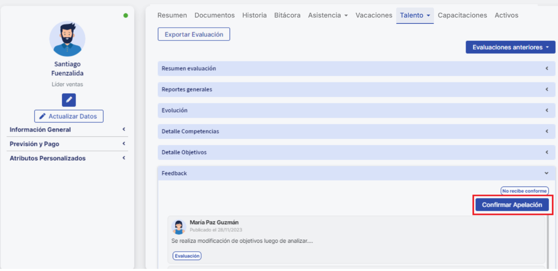 É importante ter em conta que, se o colaborador decidir apelar, o administrador da avaliação é o responsável por modificar as notas. No entanto, o avaliador descendente e o supervisor por ficha serão notificados. Além disso, apenas as notas da avaliação descendente podem ser modificadas.