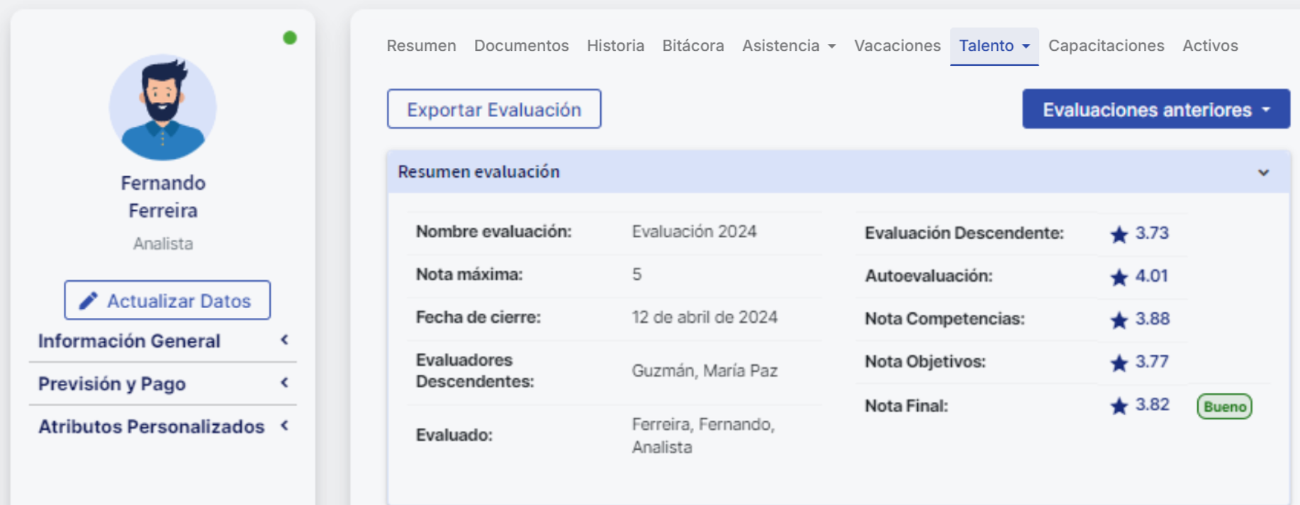 Nesta explicação, utilizaremos como exemplo uma avaliação que inclui múltiplos tipos de avaliação, onde se medem competências e objetivos. Através deste exemplo, exploraremos como se chega ao resultado final do colaborador considerando a metodologia de cálculo nota final por tipo de evaluación