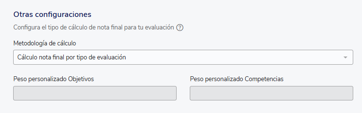 Quando você configura uma avaliação de desempenho, na aba"Resultados"você tem a flexibilidade de selecionar a metodologia que determinará como será calculada a nota final do colaborador. Por padrão vem selecionada"Cálculo nota final por tipo de evaluación".