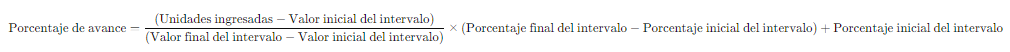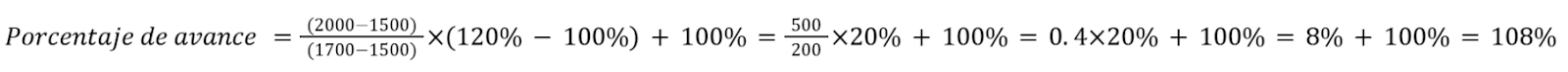 Por exemplo, para calcular o percentual de avanço de1700 unidades, esse valor se encontra nosegundo intervalo. Portanto, o cálculo considera que 100% corresponde a 1500 unidades (valor inicial do intervalo) e 120% a 2000 unidades (valor final do intervalo). A fórmula para calcular o percentual de avanço neste segundo intervalo é:
