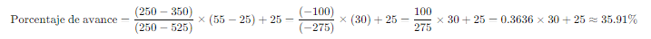 Também é possível estabelecer pontos intermediários nas escalas. Por exemplo, esta escala foi criada com pontos intermediários. Neste exemplo, calcula-se o percentual de avanço para um registro de 350 unidades, utilizando uma escala com pontos intermediários. O valor inicial do intervalo é de 250 unidades, correspondente a 25% de avanço, e o valor final do intervalo é de 525 unidades, que equivale a 55% de avanço. A fórmula de interpolação linear é aplicada da seguinte maneira: