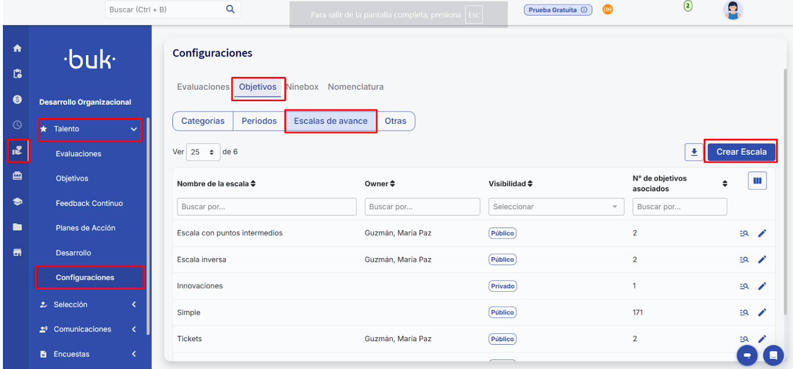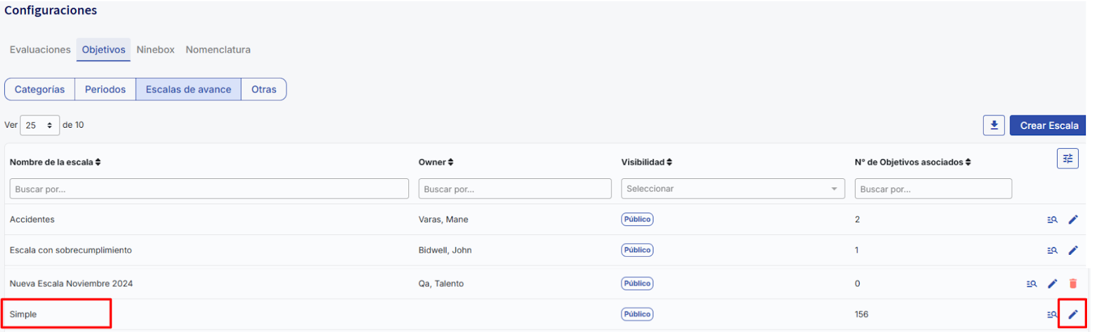 Depois, selecione "Objetivos" e clique em "Escalas de avanço", onde você encontrará as escalas criadas. Por padrão, os objetivos já criados ficarão selecionados com a escala “Simples”, mantendo seu comportamento atual. Para criar novas escalas, clique em "Criar Escala".