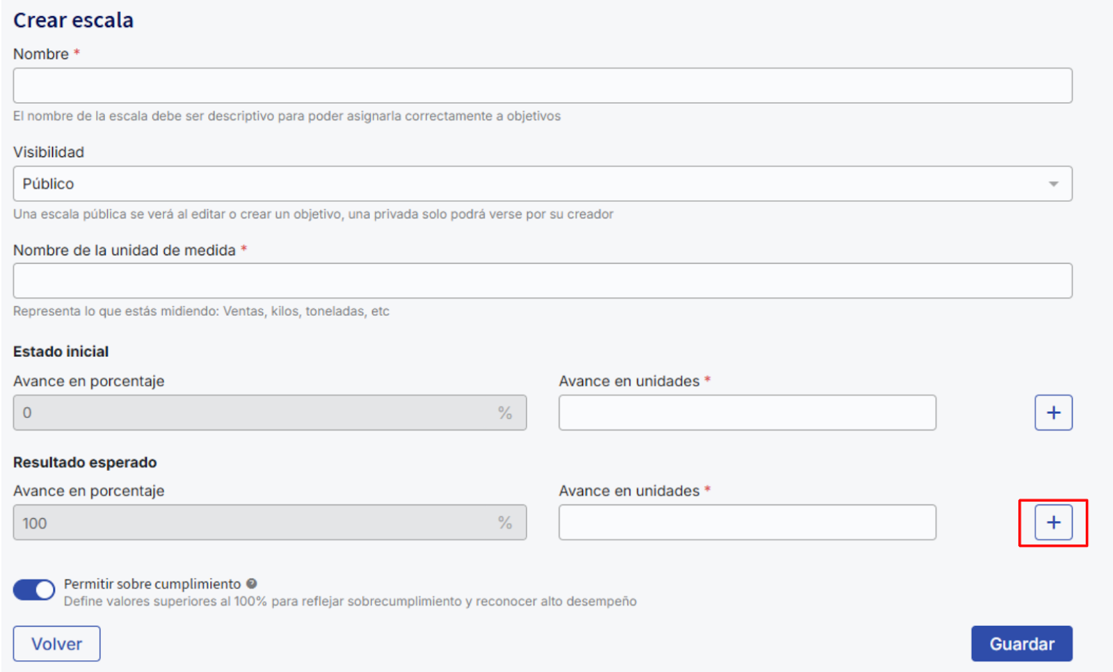 Insira as informações relacionadas ao objetivo e selecione a escala de avanço. Após selecioná-la, você verá que será indicada a unidade de medida real. Você pode clicar em "Configurar escalas de avanço" para ser direcionado automaticamente a esta seção.