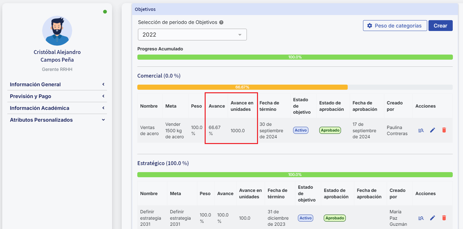Ao salvar, você verá que o percentual de avanço do objetivo será atualizado automaticamente