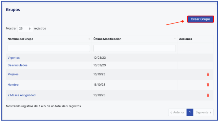 Para acessar a seção de grupos é necessário ter pelo menos a permissão de "Leitura" em "Gestão de Empregados". Essa permissão habilita a opção no menu de "Empregados" para acessar os grupos. Nesta seção você encontrará tanto os grupos predefinidos criados pelo sistema, como "Vigentes" ou "Desvinculados", os quais não podem ser modificados nem excluídos, quanto os grupos que você criou.