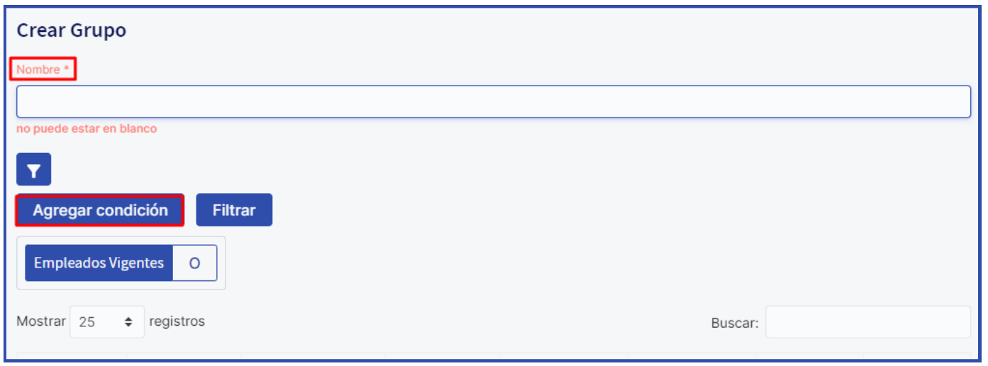 Para criar um novo grupo, você deve ir a Administrativo>>Empregados> Grupos, localizar a opção "Criar Grupos", atribuir um nome ao grupo e definir as condições desejadas. Você pode selecionar condições relacionadas à pessoa ou ao seu trabalho.