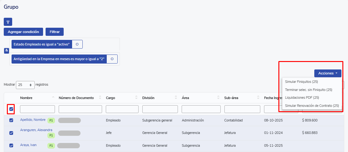 Dentro de cada grupo você poderá realizar estas ações em massa: simular rescisões, encerrar selecionados sem rescisão, obter suas liquidações em PDF ou simular a renovação de contrato.