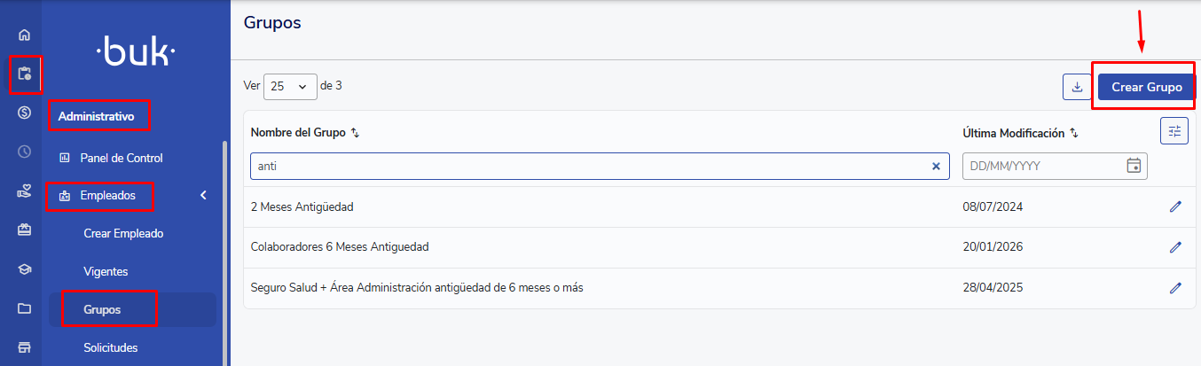 Lembre-se de que Grupos é utilizado por vários módulos da plataforma BUK, tais como Benefícios, Seguros contratados por meio da BUK, Remunerações, Assistência, entre outros. No caso deste último, lembre-se de que, quando se trata de um Grupo para sincronização de assistência, é indispensável que tenha como condição o atributo ctrlit_recinto para gerar o filtro correto, pois já houve casos em que, apesar de o colaborador (RH ou supervisor) criar sua vista com suas limitações, termina sincronizando a folha de pagamento completa por não estar contemplada a limitação do recinto