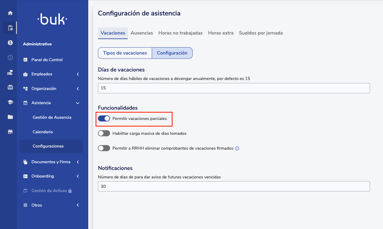 Caso criem nuevos tipos de vacaciones ou utilizem días administrativos, es muy importante que acessem aAdministrativo > Asistencia > Configuración > Vacaciones > Configuracióne ative o checkbox“Permitir vacaciones parciales”para que posteriormente puedas asignar medios días vía Beneficios.