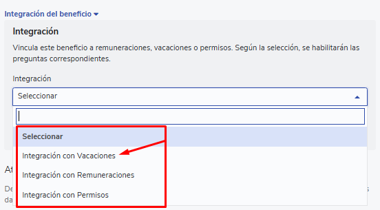 Ao chegar à opção “Integración” você encontrará 3 opções, deverá selecionar “Integración con vacaciones”: