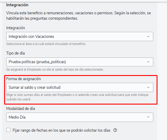 A su vez dentro de Integración con Vacaciones encontrarás 2 opciones en “Tipo de Asignación”: