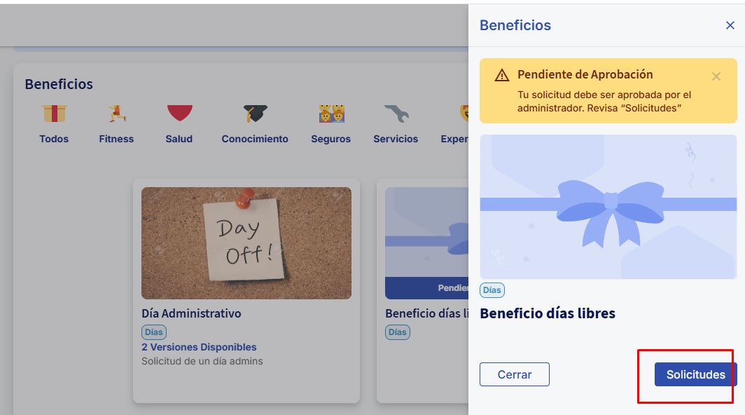 Finalmente tus Colaboradores visualizarán el beneficio y podrán solicitar días o medios días de vacaciones según los flujos mencionados anteriormenteCómo solicitar un beneficio